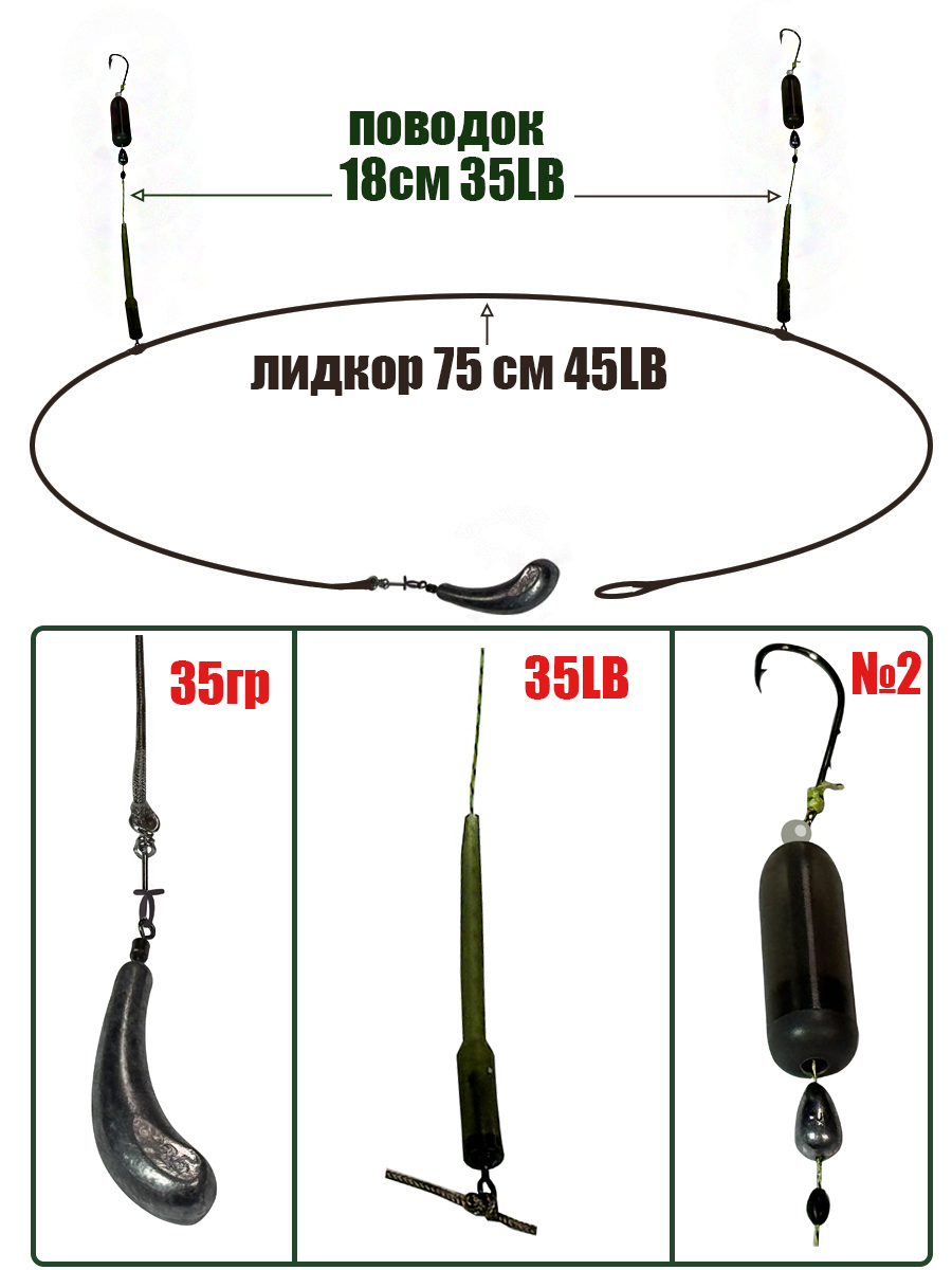 Тело оснастки сделано из лидкора (Великобритания), плотно прилегающего к дну водоема. Поводки сделаны на основе мягкого карпового материала большой разрывной нагрузки, оснащены крючком, отводом, отгруженным поплавком и стопором.